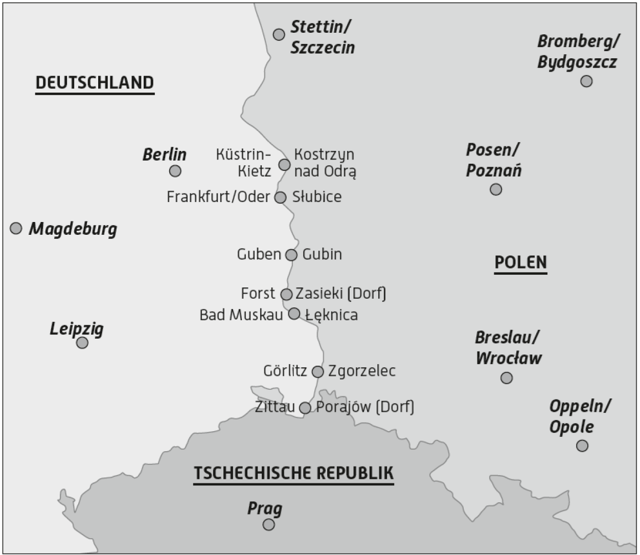 Infolge der Grenzziehung an Oder und Neiße wurden rund 50 Dorfgemeinden und sieben Städte geteilt, wovon drei von da ab als Doppelstädte fungierten, aber Doppelstädte wider Willen.