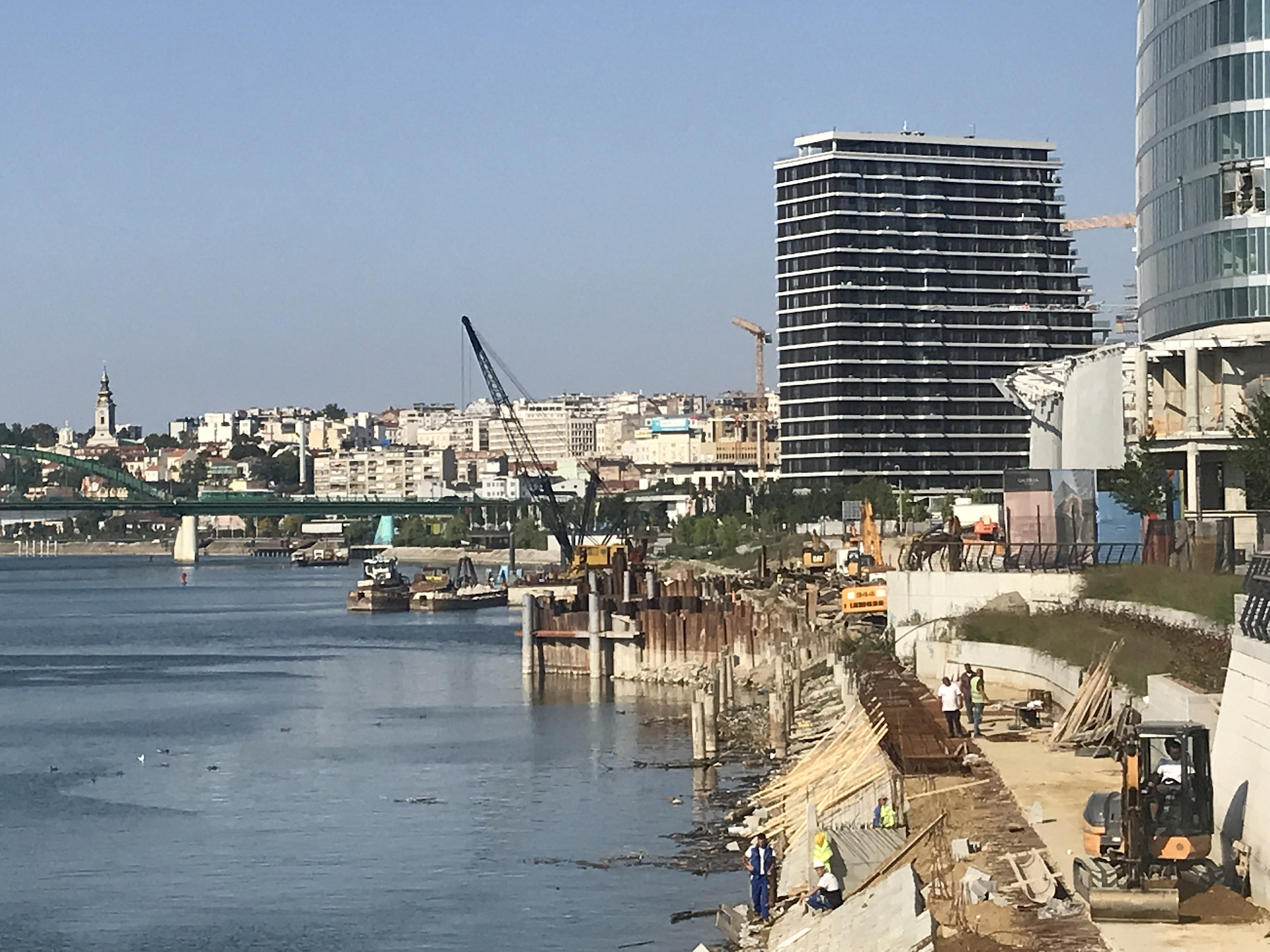 Im Hintergrund sind immer noch riesige Hochhäuser im Bau, deren Ansammlung für die Stadt Belgrad mit gerade mal 1,7 Millionen Einwohnern völlig überdimensioniert wirkt. Das Megabauprojekt mit seinen futuristischen gläsernen Bürotürmen erinnert architektonisch eher an arabische Golfstaaten oder das Moskauer Finanzzentrum. Auf 180 Hektar sind hier 5.700 Wohnungen und 2.200 Hotelzimmer geplant. Die Verbindung dieses neuen Viertels zur alten Stadt soll eine Metro möglich machen, deren Bau geplant ist. Französische Firmen bekamen den Zuschlag dafür. Für das ganze Vorhaben muss sogar der Hauptbahnhof verlegt werden.